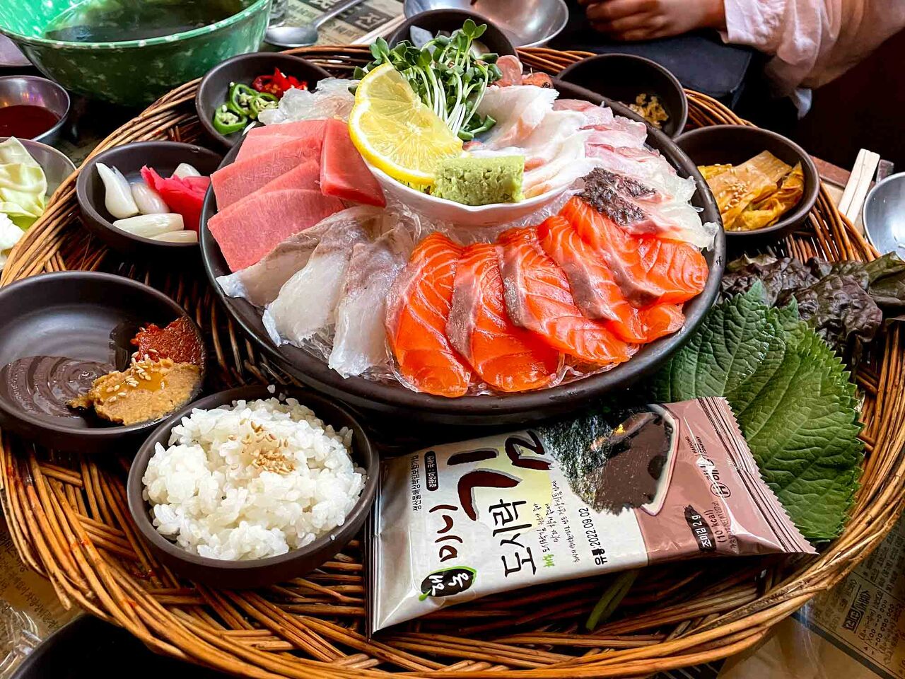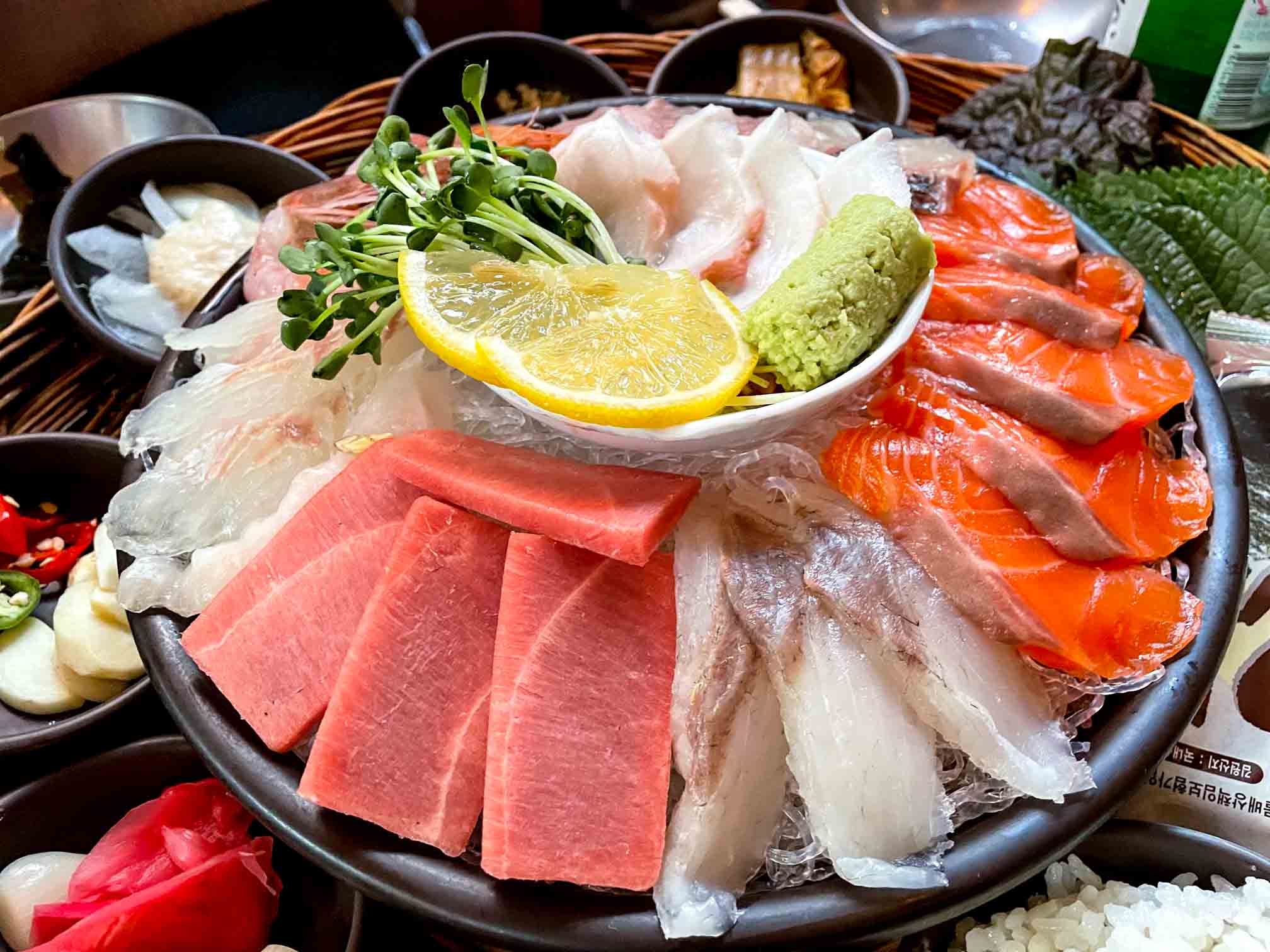 다양한 회와 함께 쌈야채, 밥, 김, 쌈장, 장아찌, 묵은지, 고추 등 회와 곁들여 먹을 것들도 다양하게 나오니 취향에 따라서 회를 즐길 수 있습니다. 저는 개인적으로 흰 살 생선을 좋아하고 지인은 붉은 살 생선을 좋아하는데 이렇게 해산물 취향이 다른 경우 주문하기 정말 좋은 메뉴인 듯합니다.