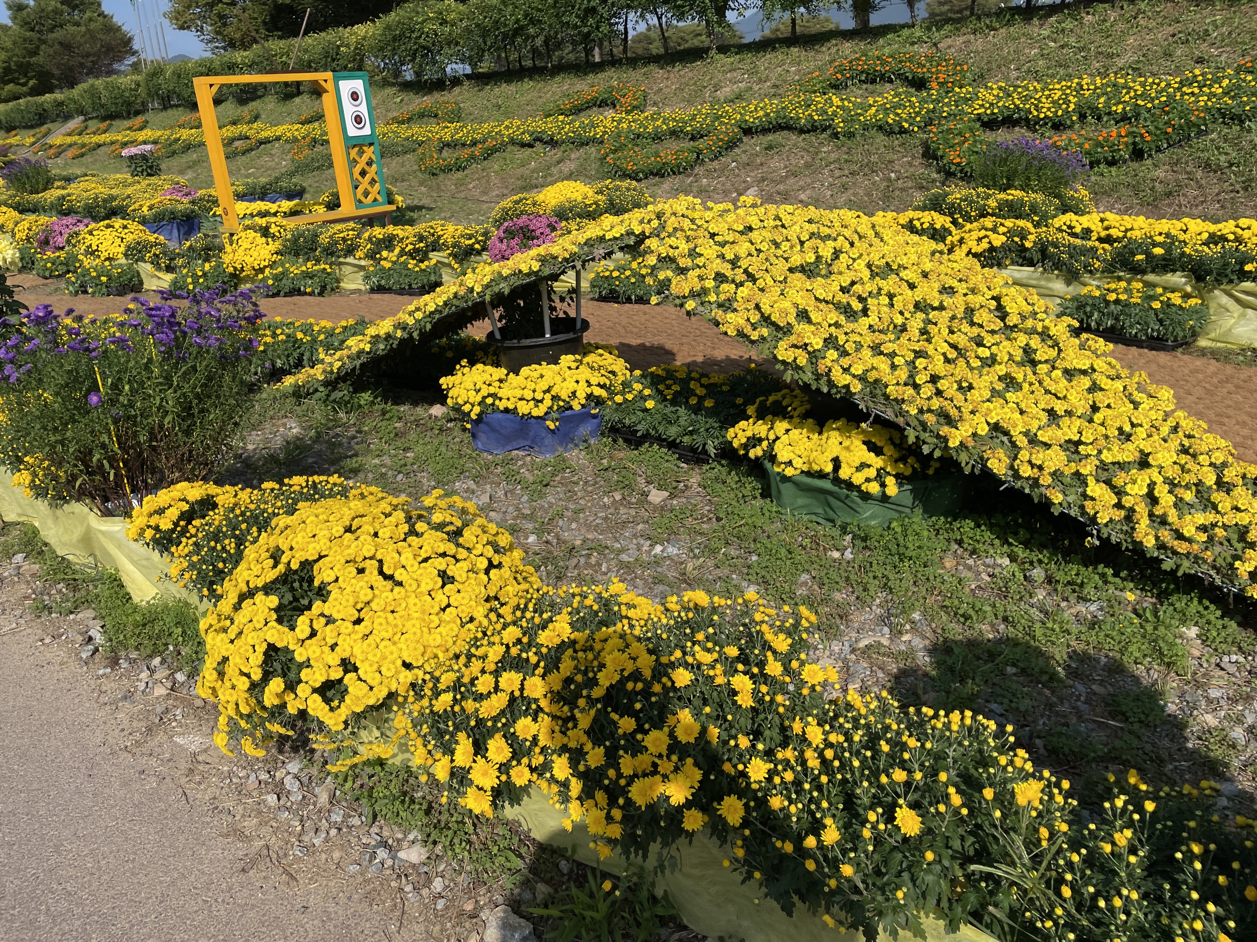 옐로우정원은 노란색 국화꽃이 주로 펴있는 곳으로 가장 인위적으로 꾸며놨다는 생각이 드는 곳이었습니다. 대신 조형물이 많아서 포토존도 다른 곳보다 많은 느낌이었습니다. 강가 쪽으로는 백일홍도 같이 펴있는데 백일홍은 다른 꽃들보다 제일 많이 퍼져있었던 꽃으로 아쿠아정원부터 해바라기정원까지 계속해서 보면서 꽃길을 걸어갈 수 있습니다.