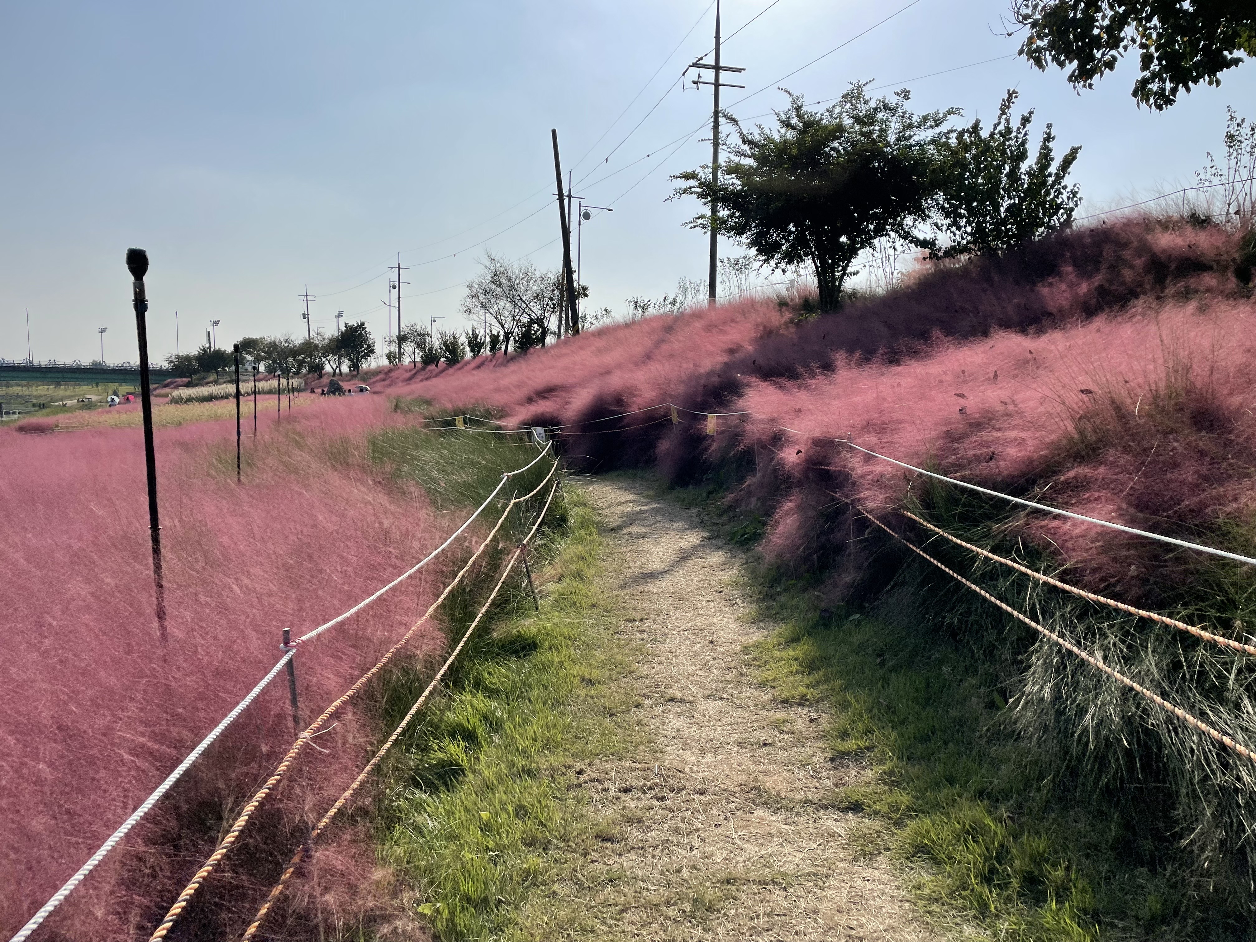 각각의 정원을 간단히 설명드리면 코스모스정원은 이름 그대로 코스모스와 황화코스모스가 넓게 펼쳐져 있는 모습이 장관인데 특히 노란 코스모스가 영롱하게 피어있는 모습이 굉장히 예뻤습니다. 코스모스 정원에서 다리를 건너서 건너편으로 넘어가면 핑크뮬리도 있는데 이제는 갈대와 함께 가을에 꼭 보러가는 핑크뮬리를 뜻하지 않는 곳에서 발견해서 반가웠습니다. 핑크뮬리 사이에는 팜파스라는 하얀 갈대같은 식물도 있어서 핑크뮬리와 함께 사진찍기도 좋으면서 팜파스와 핑크뮬리를 반반 나오게 하는 포토존에서 인생 사진을 남기기에도 좋았습니다.