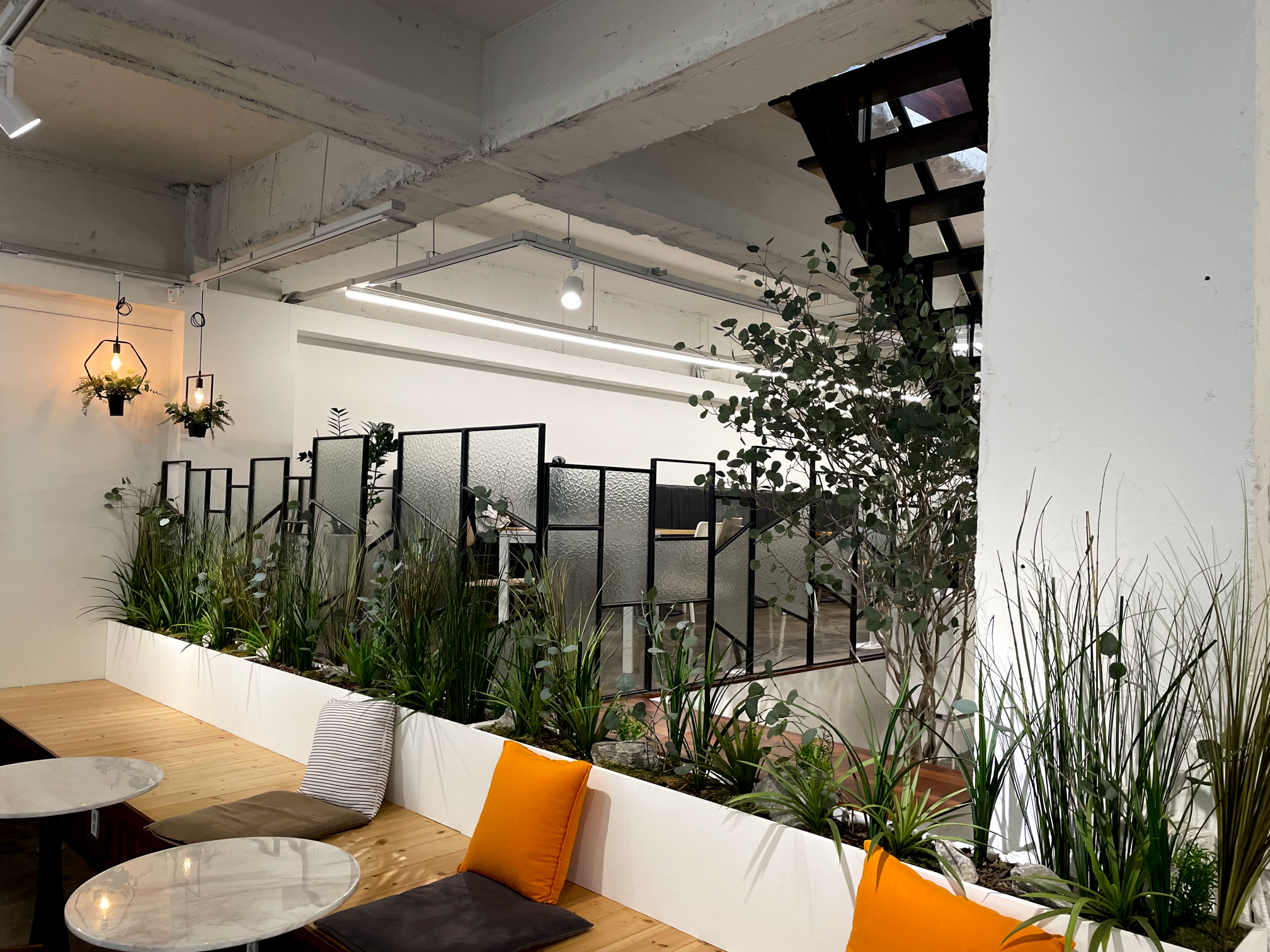 1층은 풀들과 칸막이로 공간이 좀 분리돼 있는 느낌이라서 카운터에 있는 직원이나 다른 손님들의 시선을 피할 수 있어서 좋았습니다. 다른 카페의 경우 아무래도 2층이 있으면 1층보다는 2층을 선호하는 분들이 많은데 오히려 베드포드는 반대로 손님들이 자리를 잡는 걸 볼 수 있었습니다.