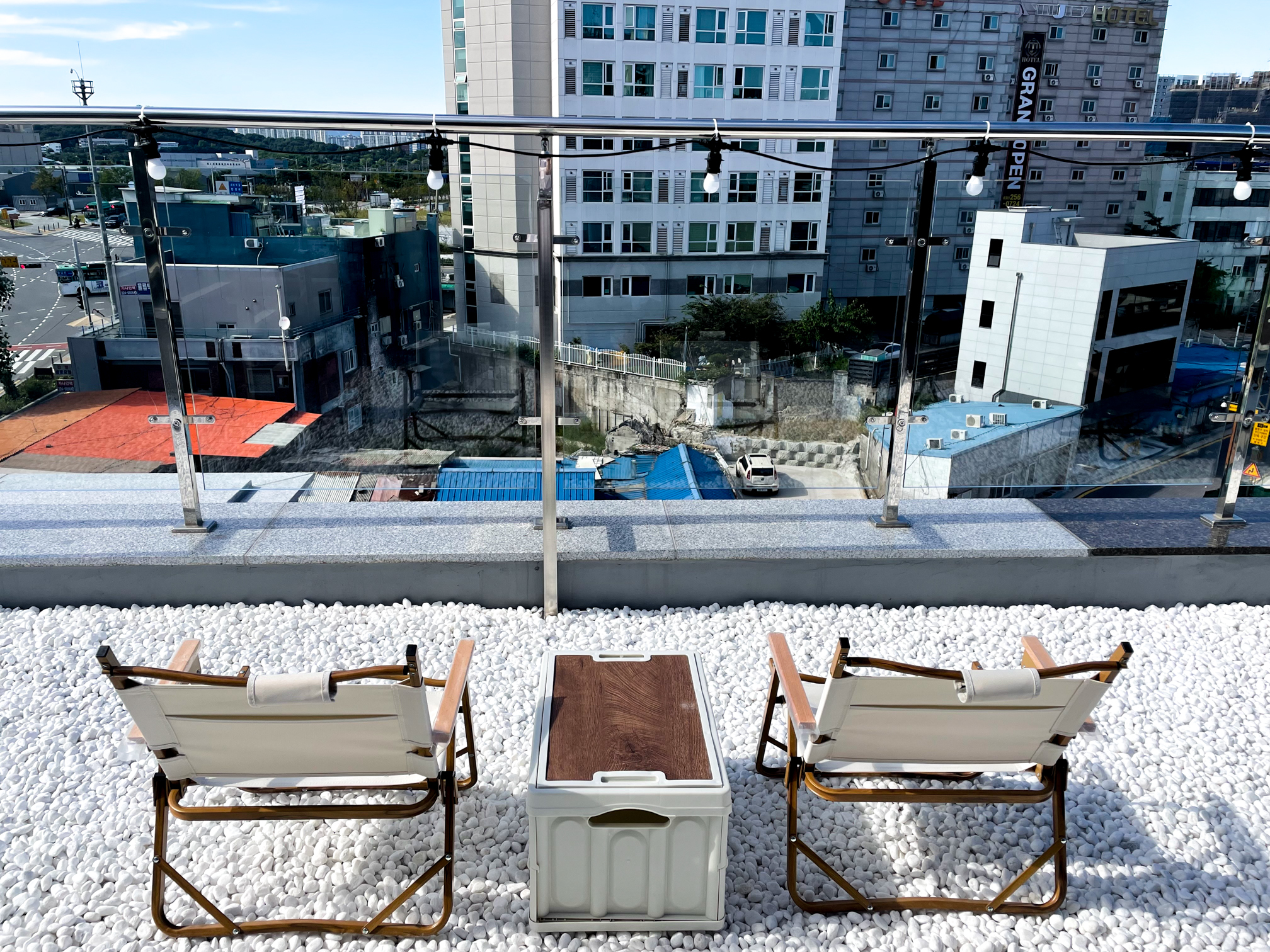 루프탑은 내부와 같은 층에 있는 테라스 공간과 그 위로 있는 옥상으로 구성돼 있는데 5층에 있는 공간은 하얀색 돌로 깔려 있고 주로 캠핑의자가 세팅돼 있어서 마치 피크닉을 온 듯한 기분을 즐길 수 있습니다.