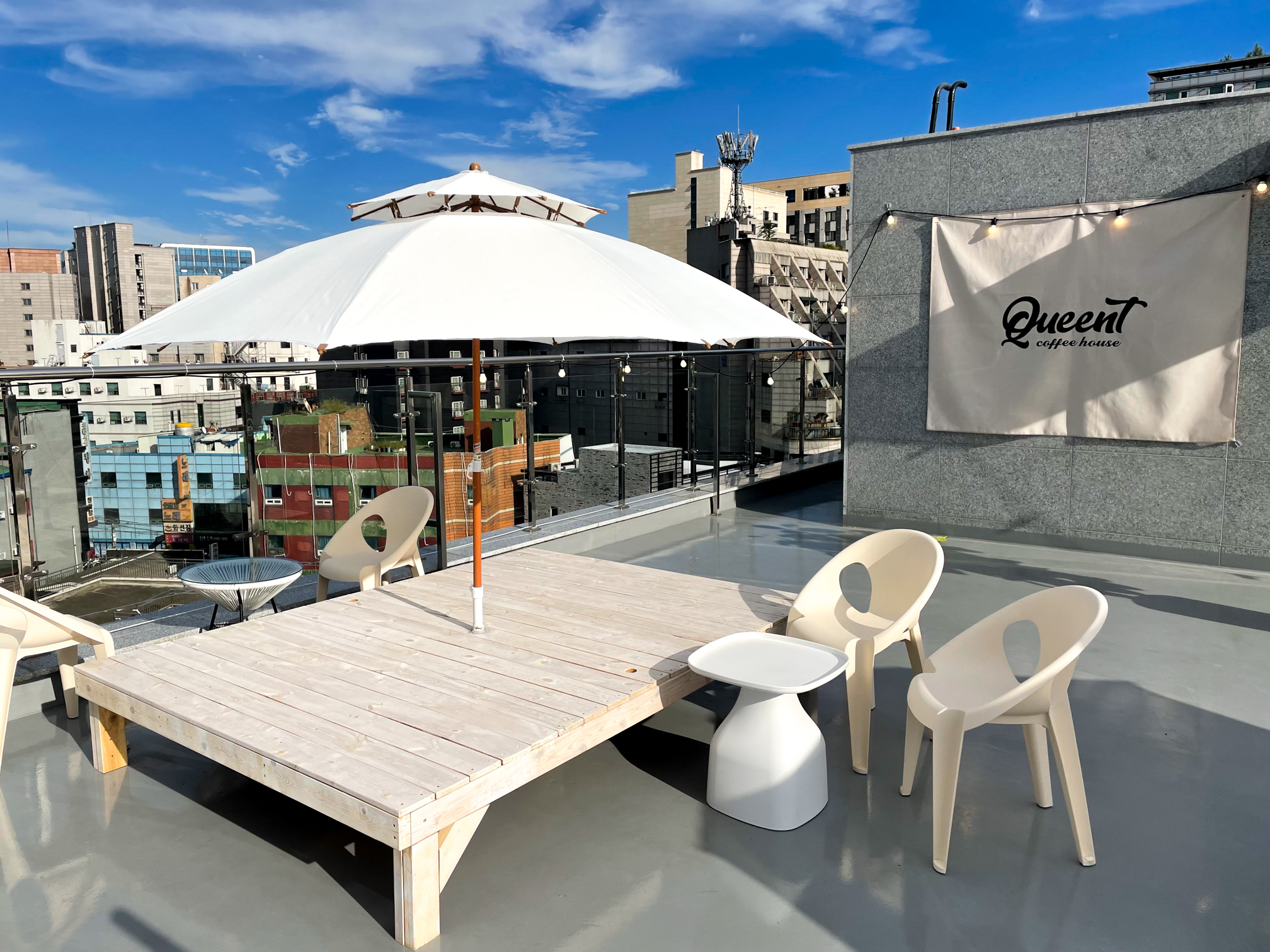 그 위층은 평상으로 세팅되어 있고 그 위로 파라솔이 되어 있어서 마치 옥상을 예쁘게 나만의 공간으로 꾸며놓은 듯하며 사진도 예쁘게 찍을 수 있습니다. 다만 퀸트 루프탑의 단점은 파라솔이나 어느 정도 햇볕을 가려줄 차단막이 설치돼 있긴 하지만 햇빛이 대각선으로 내려올 때는 많이 뜨거울 수 있다는 단점이 있습니다.