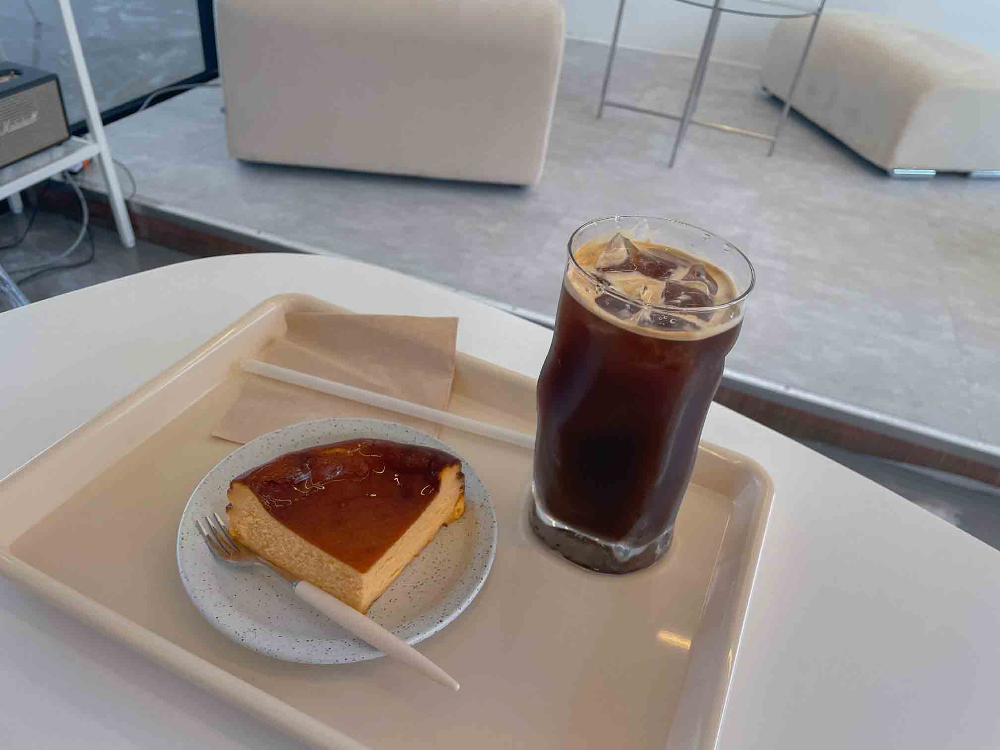디저트는 테린느와 바스트 치즈 케이크, 크로플 등을 판매하고 있는데 테린느는 다른 카페에서는 한 번도 못 봤는데 가토에서 처음으로 볼 수 있었습니다. 약간 부드러운 초콜릿이랑 비슷하다 하기에 저는 너무 단 것은 피하고 싶어서 이날은 바스트 치즈케이크와 아이스 아메리카노를 주문했습니다.
