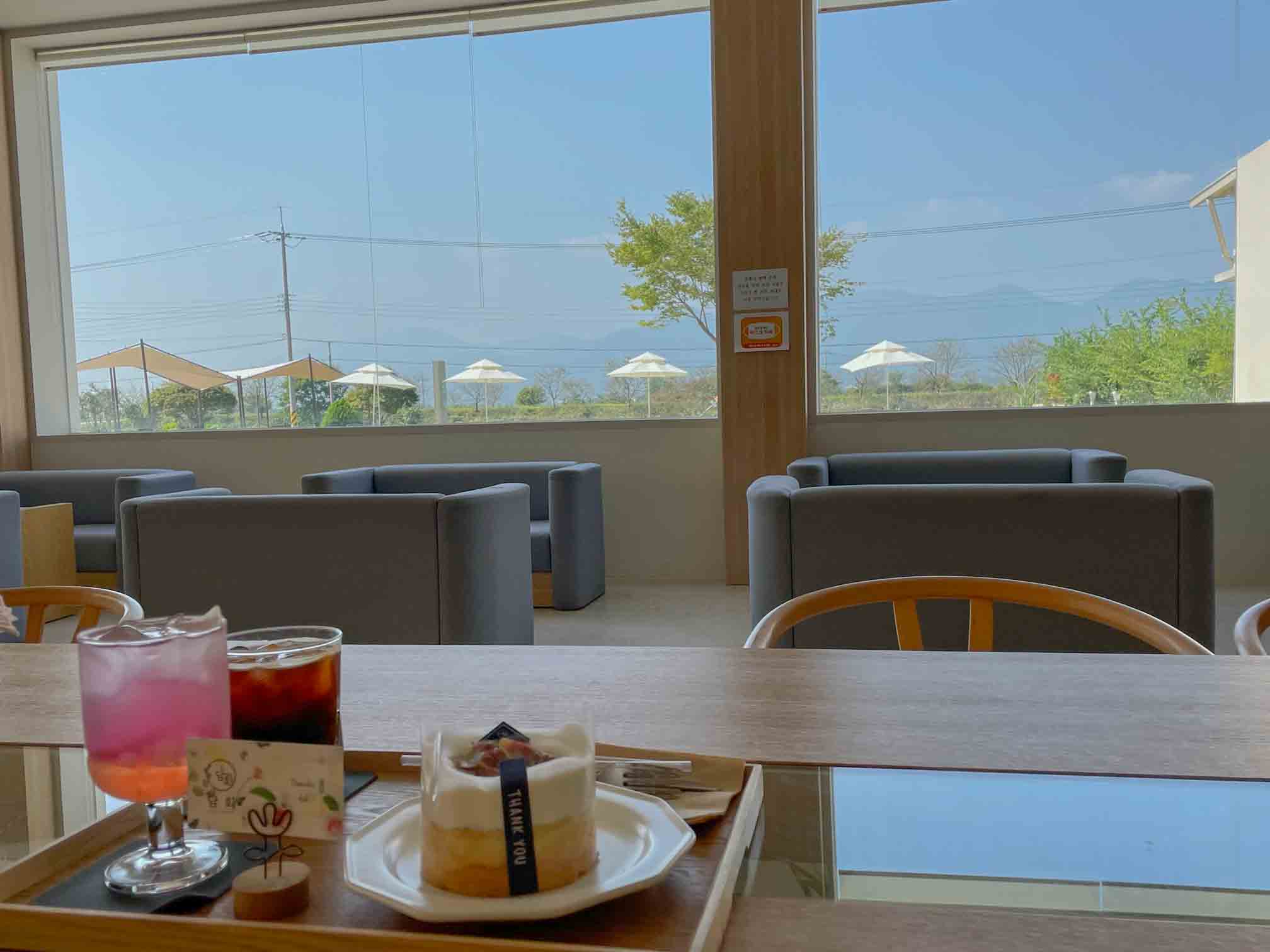 카페 내부도 공간도 굉장히 넓고 쾌적한데 가운데에는 몇 가지 종류의 빵들도 진열해놓고 판매하고 있습니다. 가장 안쪽은 조용하게 카페를 즐길 수 있는 공간이 있고 바깥쪽이 보이는 곳은 다 큰 창으로 되어있는데 흰색 바닥과 푸른색 풀과 하늘이 풍경을 예쁘게 만들어줘서 뷰도 좋았던 카페였습니다.