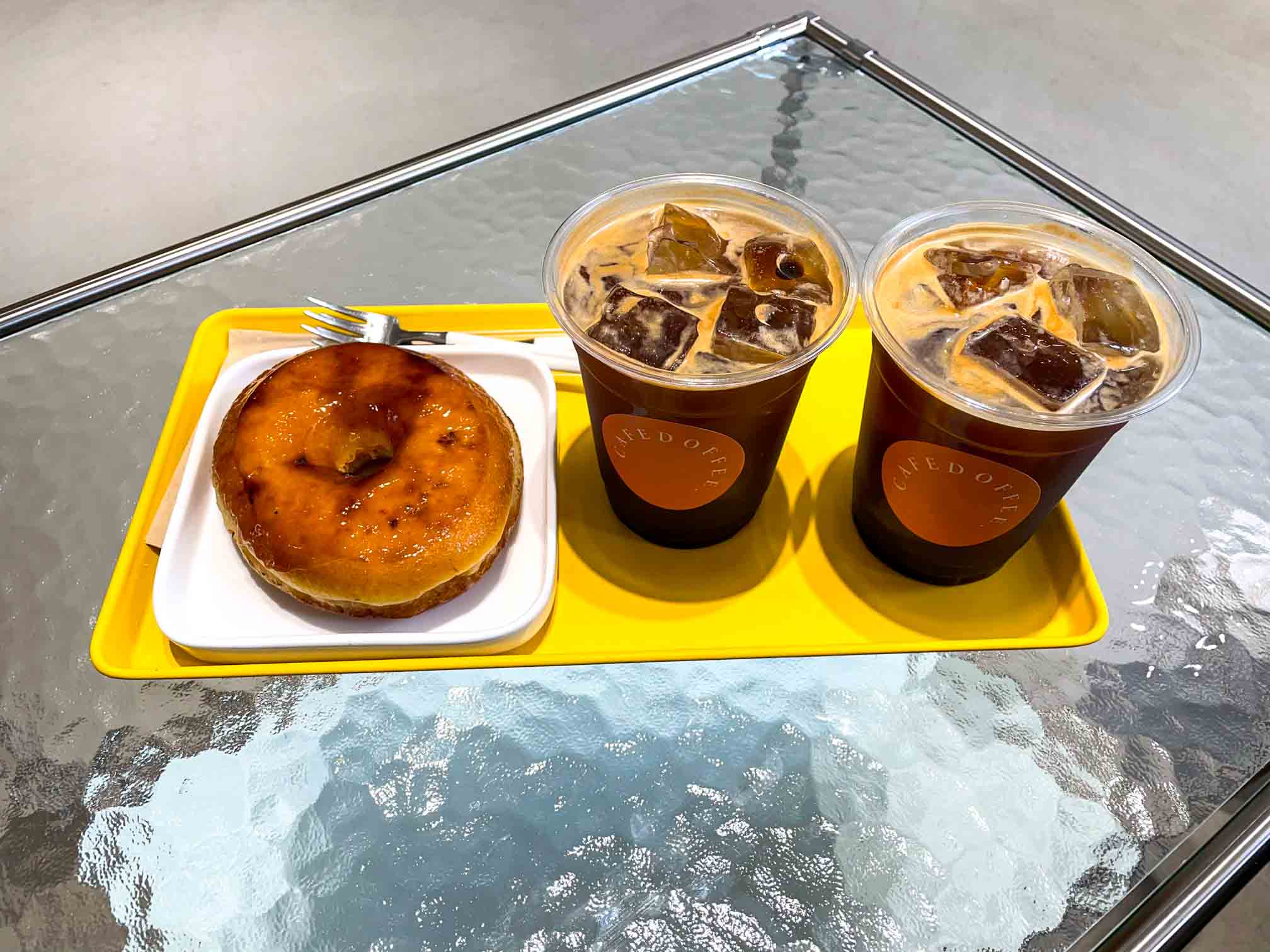 도넛은 가장 무난해 보이는 크램도넛을 주문했는데 겉에는 설탕시럽 같이 달달하게 묻어있었고 도넛 안에는 부드러운 크림이 들어있었습니다. 겉에 딱딱하게 굳어있는 시럽도 그렇고 크림도 달 줄 알았는데 생각보다 크림이 크게 달지 않고 부드러운 느낌이 강해서 계속 먹어도 별로 질리지 않고 먹을 수 있을 것 같았습니다. 아메리카노와 딱 같이 먹으니 정말 잘 어울려서 가장 기본인 메뉴인 듯했는데 굉장히 잘 골랐던 것 같습니다.