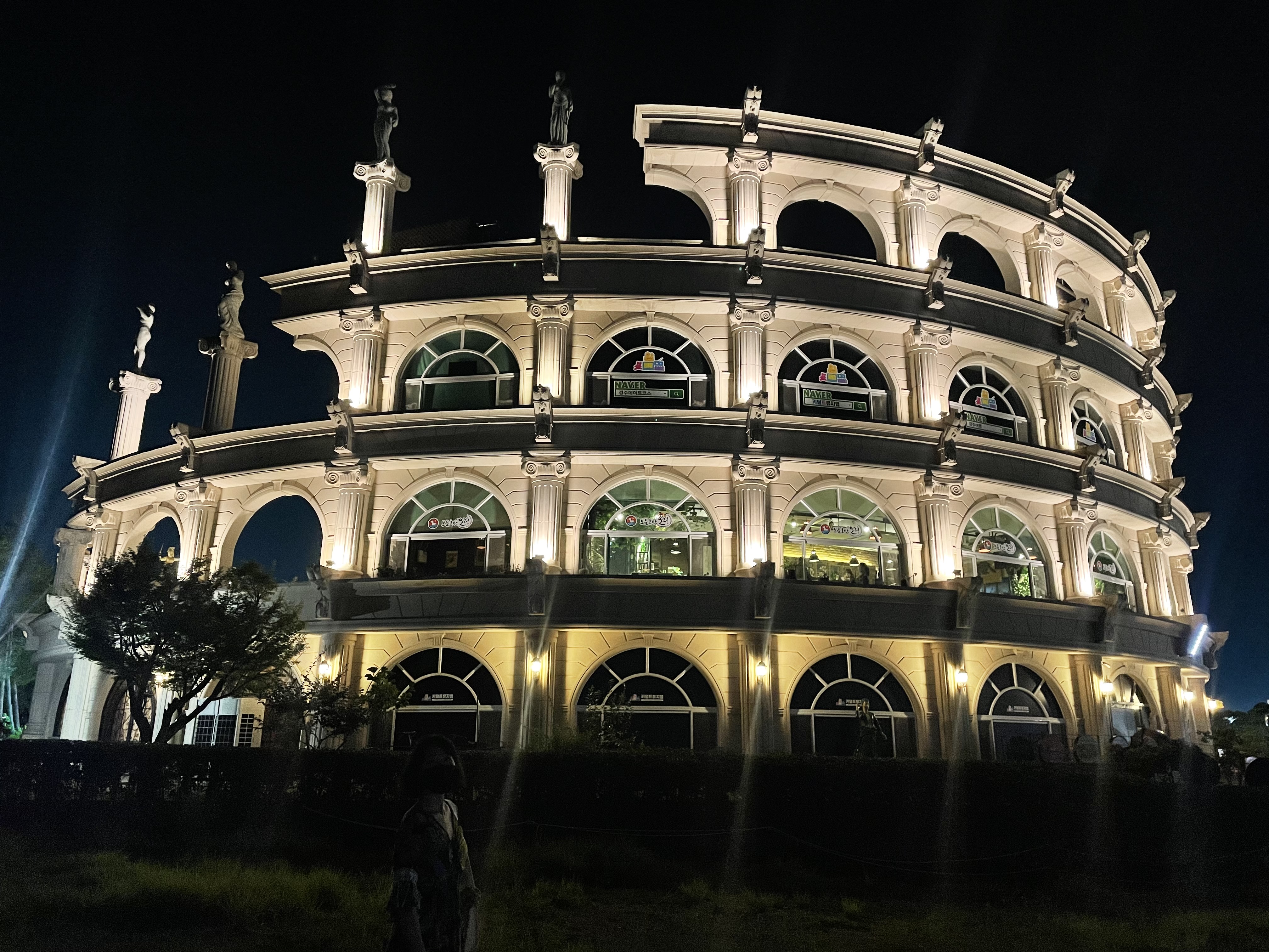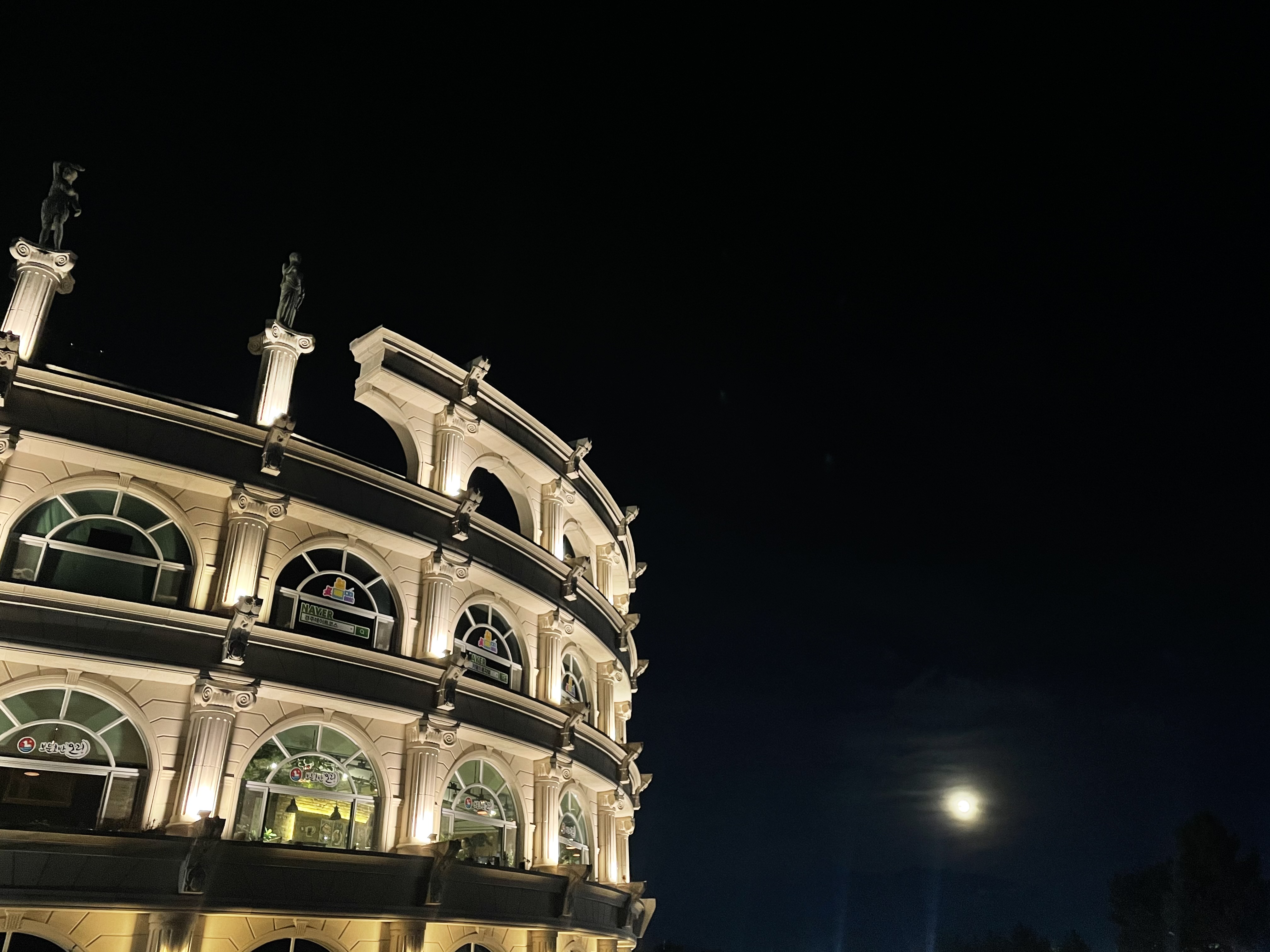 두 번째로 소개해드릴 곳은 경주 보문 콜로세움입니다. 보문 콜로세움은 각 공간마다 매장이 들어서 있어서 입구 쪽을 가까이서 봤을 때는 매장들 간판과 배너 등으로 인해서 그 생각보다 예뻐 보이진 않았습니다. 대신 좀 멀리 떨어져서 보거나 옆으로 돌아가서 구경을 하면 야경이 예쁜데 저는 운이 좋게도 보름달이 뜨는 날 방문해서 콜로세움 옆으로 환하게 떠 있는 보름달과 함께 콜로세움의 야경을 구경할 수 있었습니다.