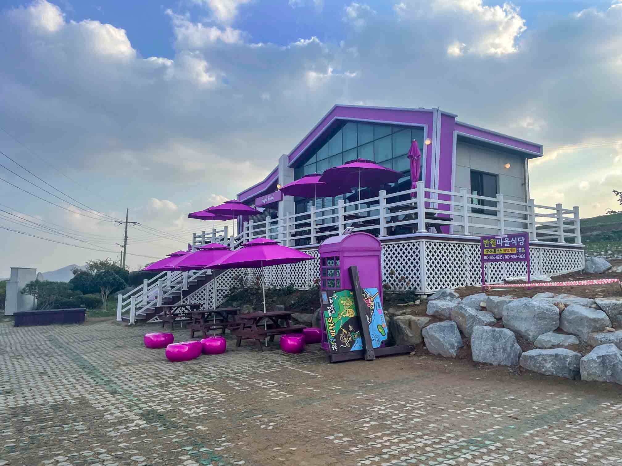 식사를 다 하고 반월도에서 박지도로 넘어간 다음 섬을 나가기로 했는데 반월도에서 박지도로 가는 길에는 보라색 카페도 있었습니다. 저희는 이용하지 않았지만 식사 후에 커피 한잔을 사서 들고 가도 좋을 것 같고 잠깐 쉬어가기에도 좋을 것 같습니다. 반월도에서 박지도를 넘어가면 반월도 방향으로 해가 져가는 걸 볼 수 있는데 시간 타이밍만 잘 맞추면 퍼플교와 노을이 만드는 경치와 함께 사진을 찍을 수 있습니다. 저희는 운이 좋게도 타이밍을 맞춰서 노을과 함께 사진을 찍고 왔는데 반월도는 시간이 너무 늦어서 구경하진 못했지만 대신 퍼플섬을 나가기 전 선물을 받은 것 같아서 기분 좋게 퍼플섬에서의 하루를 마무리했습니다.