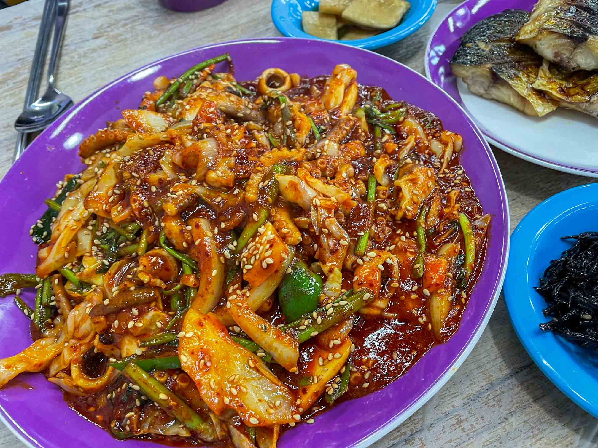 신안 반월마을식당에서는 메인으로 낙지볶음을 주문했는데 신안의 오동통한 낙지가 한가득 들어가 있고 매콤하면서 밥에 비벼먹기 좋아서 맛있었습니다. 특히 좋았던 점은 낙지가 정말 하나도 안질 기고 씹는 느낌이 너무 부드러워서 왜 신안 갯벌 낙지가 유명한지 알 것 같았고 오랜만에 낙지로 제대로 몸보신도 한 것 같았습니다. 낙지볶음은 그냥 먹어도 맛있지만 역시 양념과 함께 퍼플밥에 비벼먹으면 순식간에 밥 몇 공기는 해치울 정도로 맛있어서 만족스러운 신안 퍼플섬에서의 식사였습니다. 두 가게 중 어디를 갈까 고민했는데 다행히 선택에 실패를 안 해서 즐거운 여행을 지속적으로 이어갈 수 있었습니다.