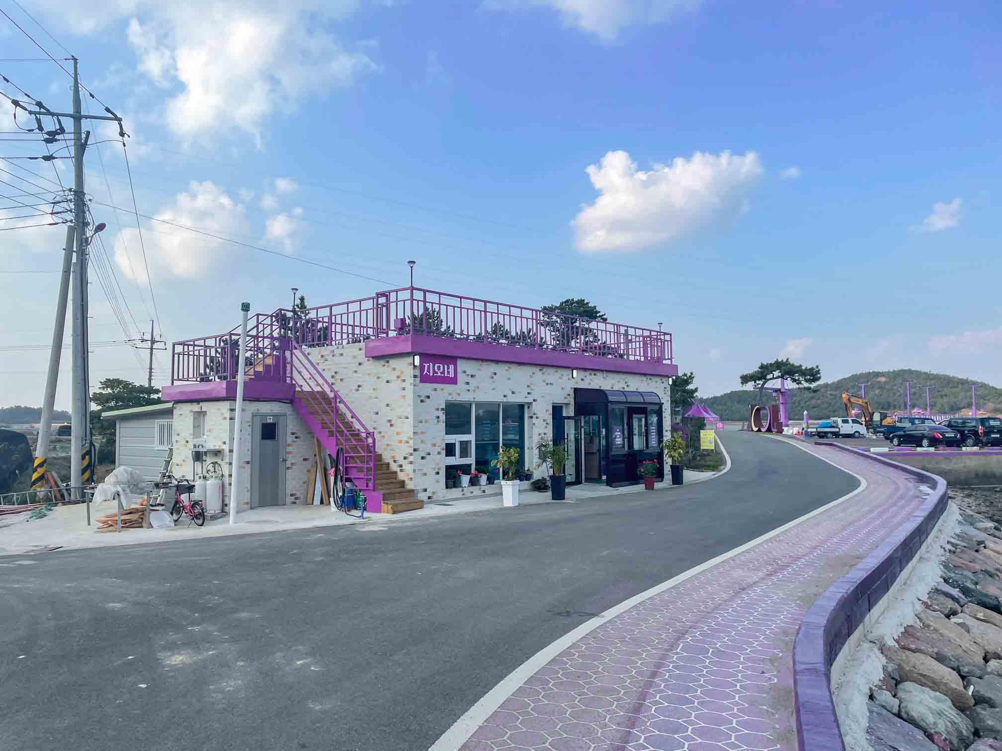 식사를 다 하고 반월도에서 박지도로 넘어간 다음 섬을 나가기로 했는데 반월도에서 박지도로 가는 길에는 보라색 카페도 있었습니다. 저희는 이용하지 않았지만 식사 후에 커피 한잔을 사서 들고 가도 좋을 것 같고 잠깐 쉬어가기에도 좋을 것 같습니다. 반월도에서 박지도를 넘어가면 반월도 방향으로 해가 져가는 걸 볼 수 있는데 시간 타이밍만 잘 맞추면 퍼플교와 노을이 만드는 경치와 함께 사진을 찍을 수 있습니다. 저희는 운이 좋게도 타이밍을 맞춰서 노을과 함께 사진을 찍고 왔는데 반월도는 시간이 너무 늦어서 구경하진 못했지만 대신 퍼플섬을 나가기 전 선물을 받은 것 같아서 기분 좋게 퍼플섬에서의 하루를 마무리했습니다.