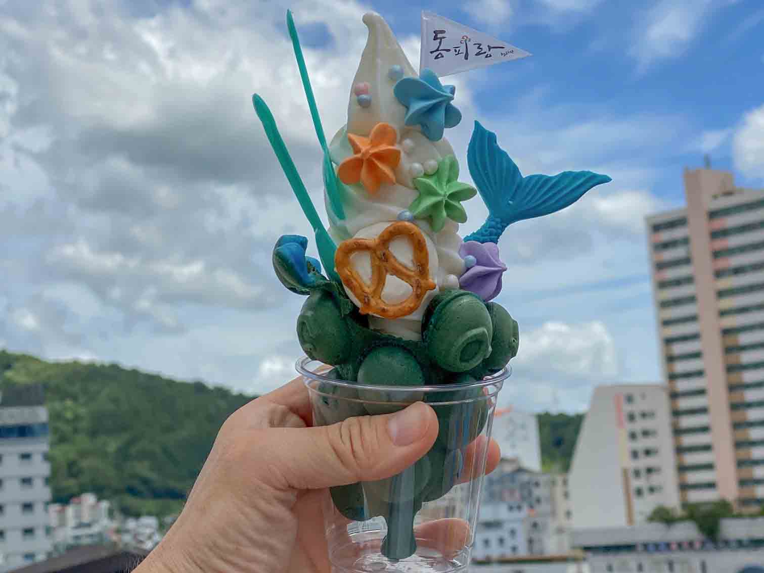 동피랑 전복마을이 있는 동피랑에는 뒤로 올라가시면 절벽마을인 동피랑 벽화마을이 있는데 경사가 높긴 하지만 올라가 보시면 아이스크림 가게들이 줄지어 있는 것을 볼 수 있습니다. 그중에서 제일 시선을 강타하는 것은 다름 아닌 동피랑 와팡의 인어공주 와팡 아이스크림으로 와팡이라는 와플 비슷한 빵을 콘 대신 사용해서 아이스크림을 올려주고 그 위에 머랭 쿠키와 인어공주 꼬리모양의 초콜릿 등으로 예쁘게 꾸며준 아이스크림입니다. 보기에도 예쁘고 달달한 머랭쿠키와 초콜릿도 올라가 있어서 당 보충도 제대로 할 수 있습니다.